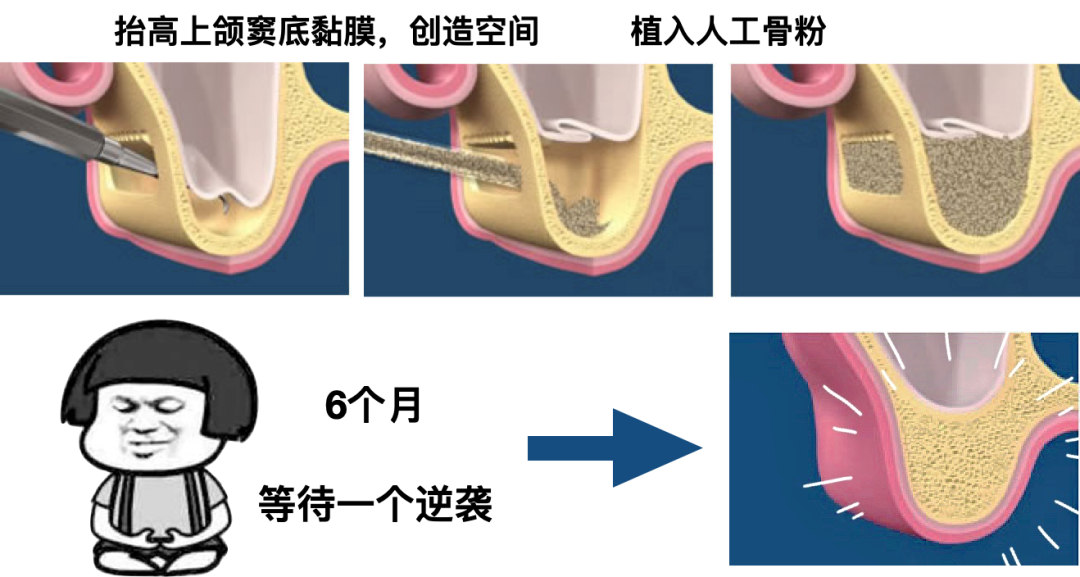 一、什么是上颌窦外提升?上颌窦外提升就是从上颌窦外侧壁的骨板开一扇小窗户,打开上颌窦,用特殊的器械剥离上颌窦底黏膜,将黏膜抬高,然后植入人工骨粉来增加种植区域骨高度。剩余骨量能获得种植体初期稳定的可同期植入种植体,否则就分阶段植入种植体。