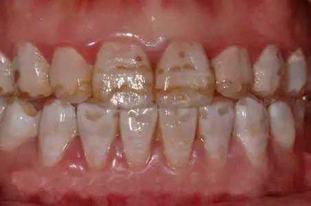 氟斑牙是指牙齿发育、矿化期间,机体摄入过量的氟引起牙釉质钙化不良损害,主要表现为牙釉质失去正常的光泽和透明度,出现不同程度的白垩样变、着色和凹陷缺损等病变,一旦形成残留终生,轻则影响美容,重则由于严重缺损或过早脱落,影响咀嚼消化功能危害健康。氟斑牙是地方性氟中毒最重要的表现。