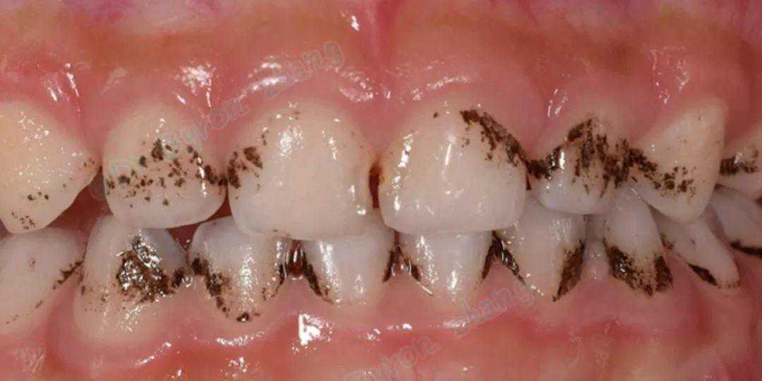但在口腔卫生良好的情况下,小孩可以减少洗牙频率,临床上碰到很多小孩子因为长期喝可乐,或者吃颜色很深的食物,导致有严重的色素沉着,比如这样: