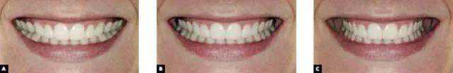颊旁间隙过小甚至为零的,会造成笑的时候“满嘴都是牙”的局面,如果你的牙齿形态又比较大就比较吃亏了,毕竟不是谁的牙都能达到牙齿的黄金比例为高度约在9~11毫米之间,前排门牙的长宽比为1.618:1,门牙:侧门牙:尖牙之高度比为1.618:1:0.618的。