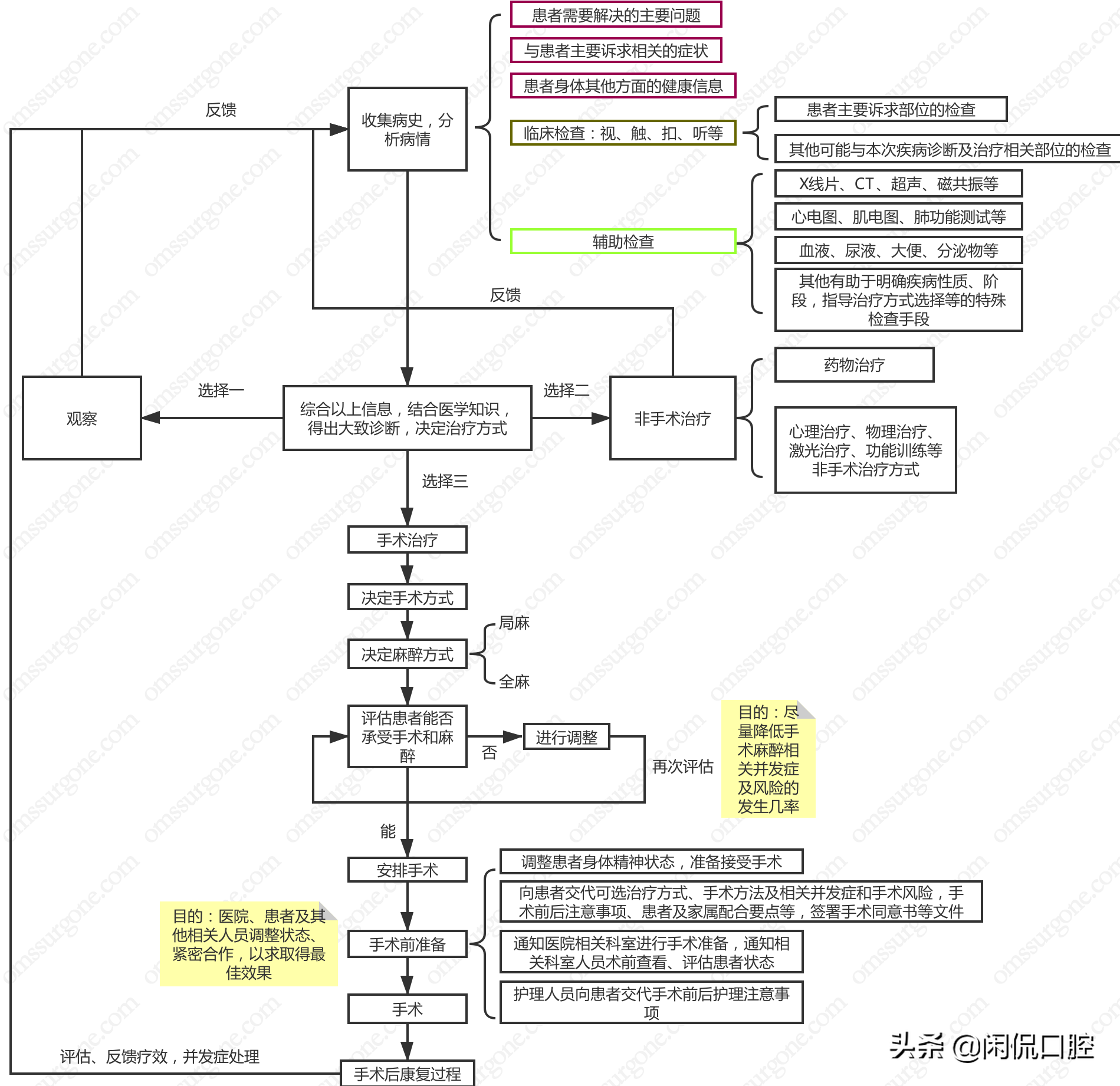 如果初次评估以后,决定需要进行手术治疗,那么就需要进一步评估患者的身体能否承受手术和麻醉的打击,如果需要调整以后才能承受,那么就进行相应治疗以后再次评估,如果无法通过调整来改善身体状态,那么就退而采取其他非手术治疗方式;如果初次评估以后或者调整后再次评估以后认为患者可以承受,那么就准备进行手术。这个评估以及调整的目的在于尽量让患者的身体状态处于最佳水平,以尽量减少手术风险的发生,避免影响手术以及影响手术后愈合的情况的发生。