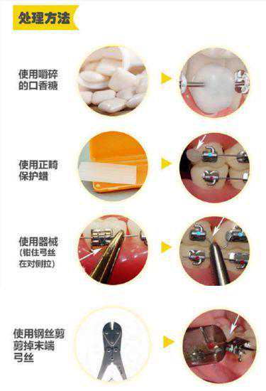 处理:1.弓丝末端过长对黏膜刺激时,用保护蜡或咬软的口香糖,贴于末端过长的钢丝上;2.用长细的钳头将弓丝末端弯成小圈状或用眉夹夹住往反方向拉;3.若钢丝脱出颊面管,用眉夹夹住钢丝穿入颊面管中;4.剪掉过长弓丝。