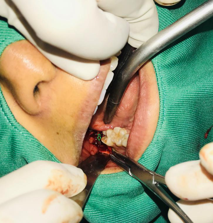 找到并取出金属异物后,搔刮拔牙窝,清除肉芽组织,最后缝合创口。