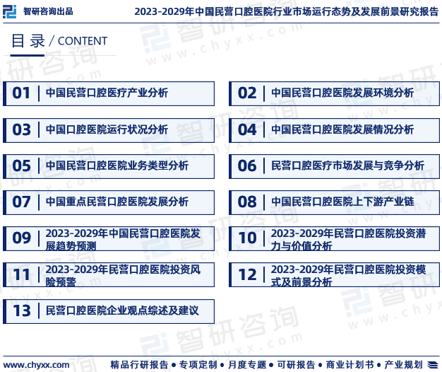 由智研咨询专家团队精心编制的《2023-2029年中国民营口腔医院行业市场运行态势及发展前景研究报告》(以下简称《报告》)重磅发布,本报告由智研咨询行业研究团队联合撰写,经专业的报告编撰团队反复修改打磨,最终得以呈现。