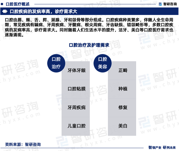 口腔疾病种类繁多,伴随人全生命周期,常见疾病有龋病、牙周疾病、牙髓病、根尖周病、牙齿缺损、错颌畸形等,多数口腔疾病的发病率高,诊疗需求大。同时随着人们生活水平的提升,洁牙、美白等口腔医疗需求也逐渐涌现。