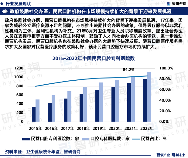民营口腔机构在鼓励社会办医的大趋势下快速发展,随着口腔医疗服务需求扩大及国家对民营医疗服务的政策不断利好,预计民营口腔医疗市场将持续扩大。