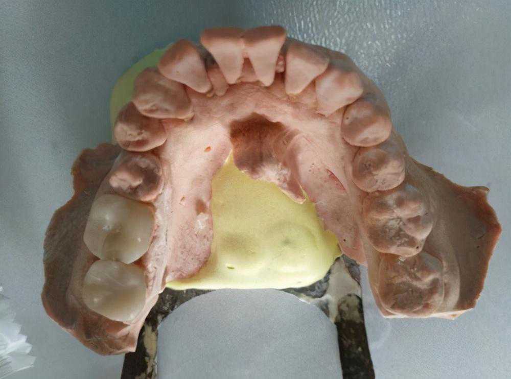 暂时修复体在口外模型上制作。该方法操作方便,且不受时间限制,制作质量较高;当多个牙需制作暂时修复体时,容易塑造良好的轴面及拾面形态,不受就位道不同的限制。缺点是较为费工费时。