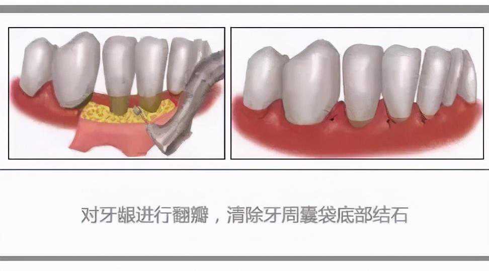 牙周囊袋深度超过5mm者,需动小手术将牙龈翻开(牙周翻瓣术),针对牙周囊袋底部进行彻底清创。