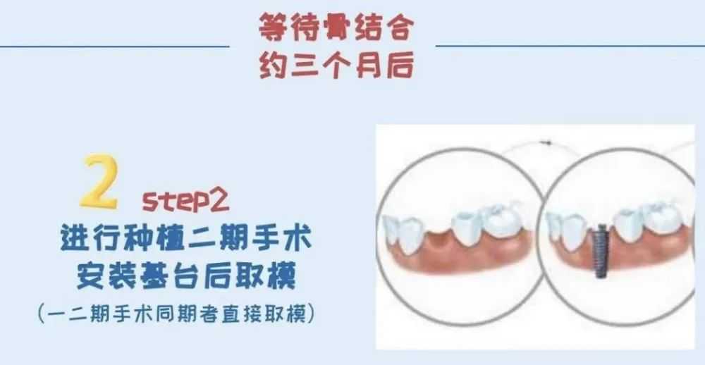 植入种植体后,需要等待3~6个月种植体与牙槽骨形成骨结合。在等待过程中,患者应避免种植区咀嚼坚硬的食物,以免导致种植体松动、脱落。若一期手术时埋入种植体的,则3~6个月后需做二期手术,拧入愈合帽使牙龈成形,以便后期牙冠戴入。
