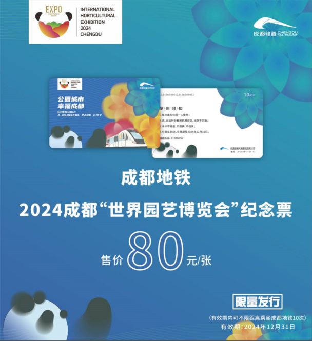 结合世园会各会场、成都历史人文景点、赏花踏青推荐等出行热点,设计上线“世园会版”地铁美景地图;结合世园会相关视觉元素,设计并发行世园会纪念票卡。