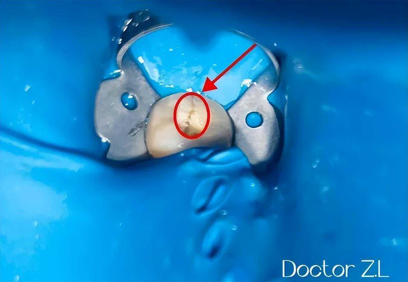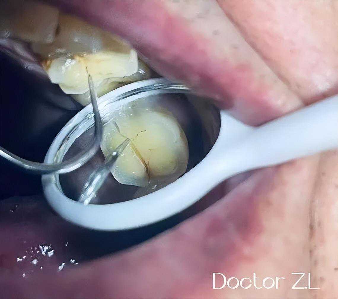 待反复确诊患牙后,降低患牙咬合,就已经可以清晰看到患牙远中邻面的纵向裂纹。