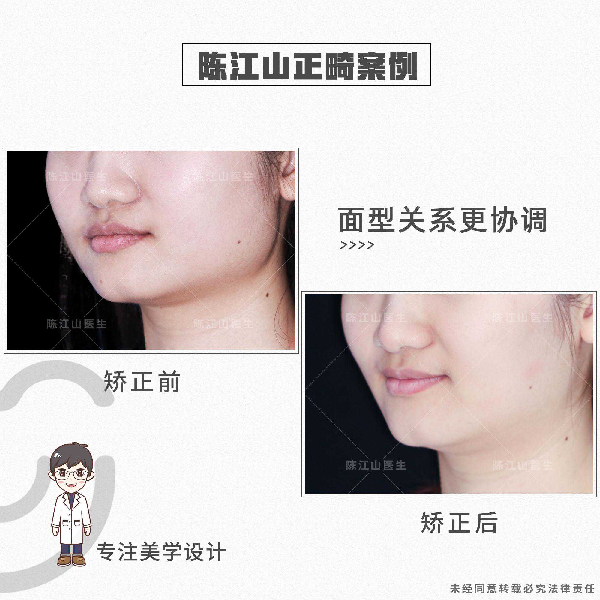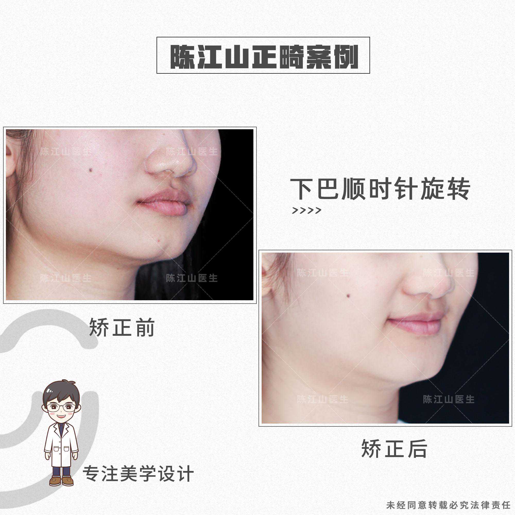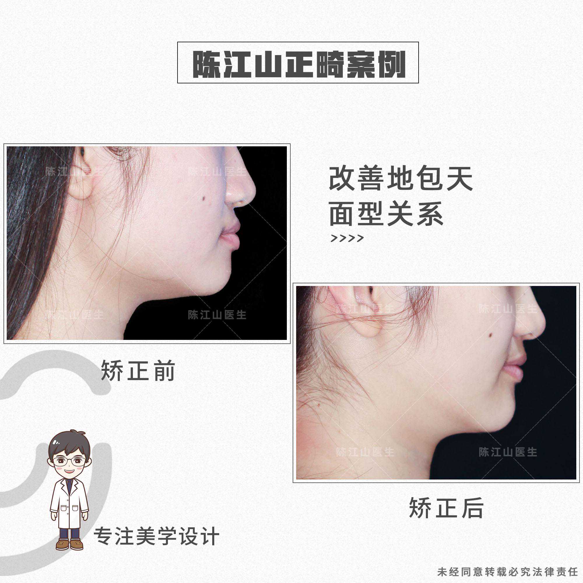 患者的矫正方案是不拔牙,关键在于调整地包天的过程中,要升高后牙高度,让颌平面出现顺时针旋转,下巴颏向下、向后走,改善地包天面型、面下1/3短以及下颌角宽的问题。