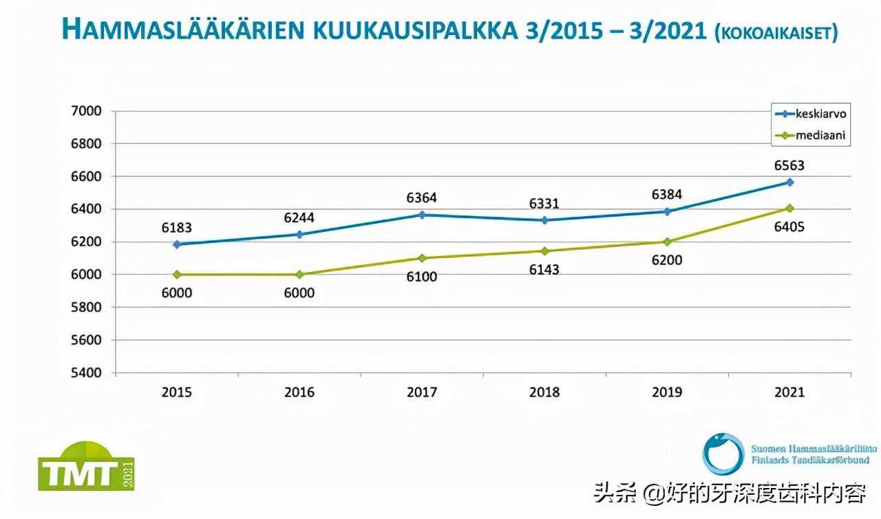 在这个全球幸福指数最高的国家当牙医,薪资收入水平如何?芬兰统计局和芬兰劳动力市场调查联合会的数据显示,2020年工薪阶层的收入中位数约为每月3200欧元。相比起来,芬兰牙医的月收入中位数达到约6400欧元,明显高于普通工薪阶层2倍。