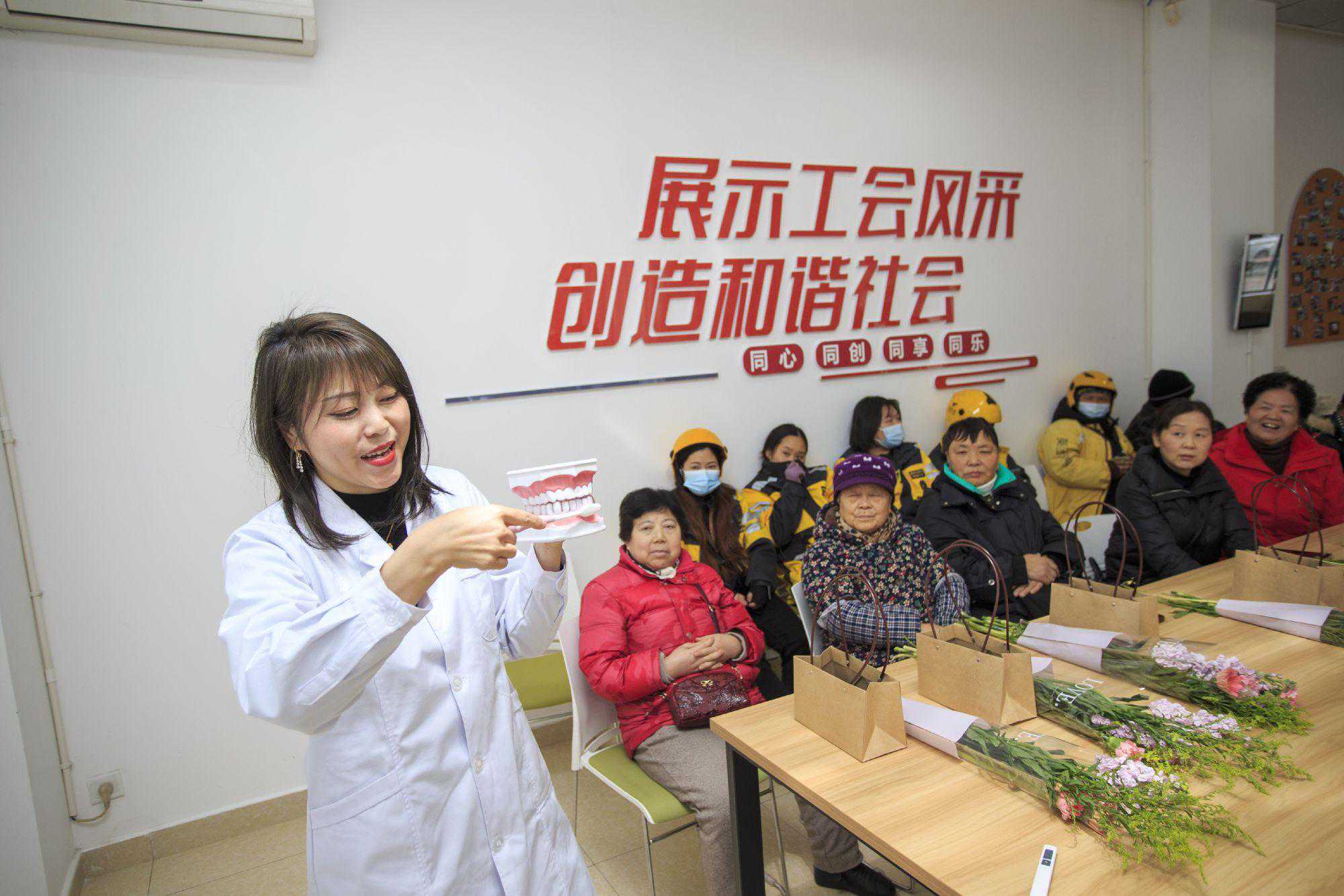 活动当天,特别邀请华美口腔牙科医护团队开展口腔健康知识专题讲座,现场为大家讲解口腔健康的重要性,还耐心细致地为女性同胞进行检查,并从日常饮食等方面给予健康指导和专业建议。同时,岷江路社区也为新就业形态女性劳动者送上暖心关怀礼物并致以节日的祝福。