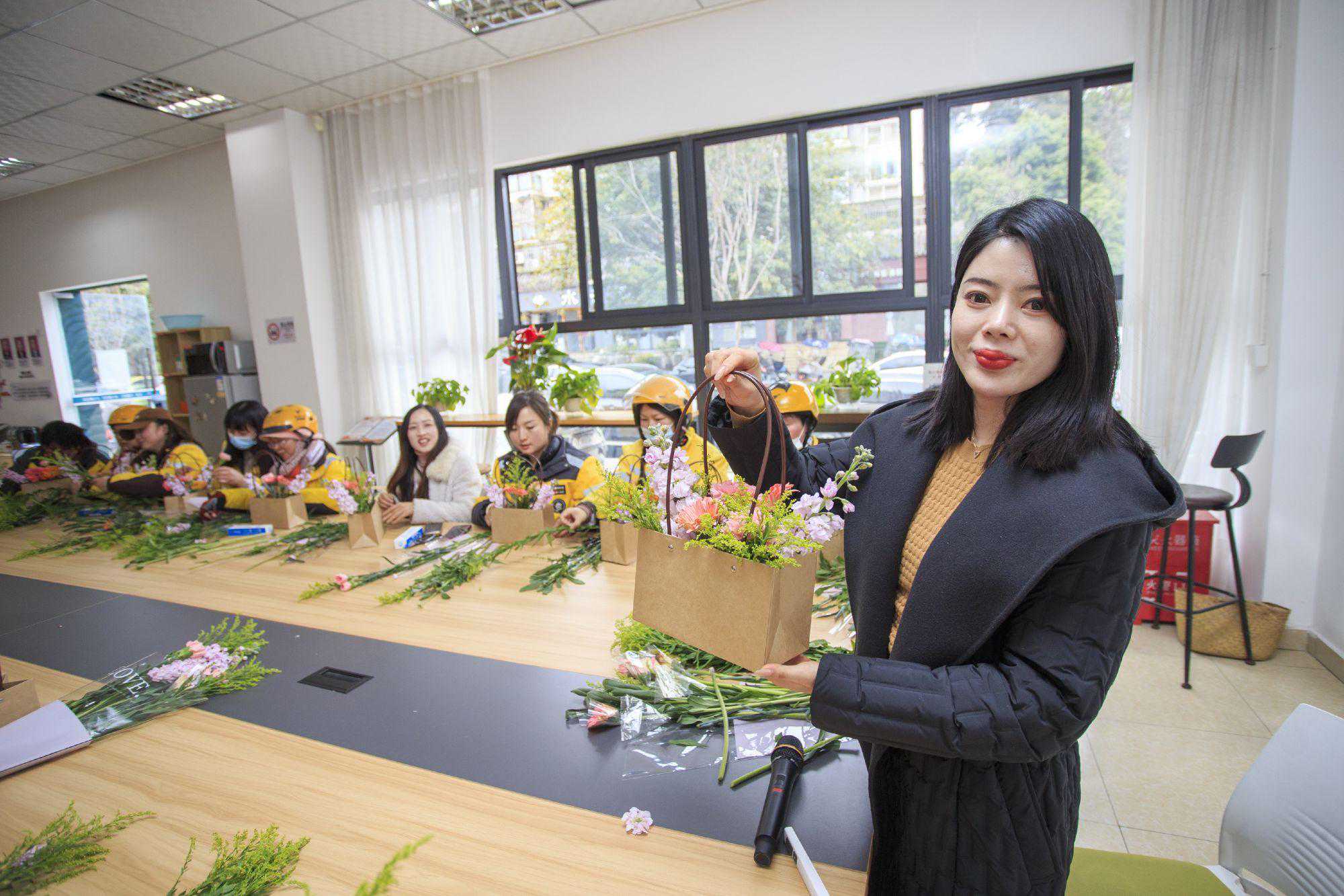 “想要插花作品好看,层次需要做的更丰富…”当天下午2点,岷江路社区暖心驿站内热闹非凡,女性外卖配送员、环卫工人们大家共聚一堂、亲如一家。在花艺师娓娓道来的选花、剪枝、搭配技巧讲解中,带领大家充分感受花艺的独特魅力。剪接、绑枝、造型、固定……在老师的悉心指导下,大家专注于手里的花草,尽情发挥、巧妙搭配,一个个错落有致、创意十足的插花作品在大家的欢声笑语中制作完成,在座的女性同胞们纷纷展示着自己的作品并合影留念。