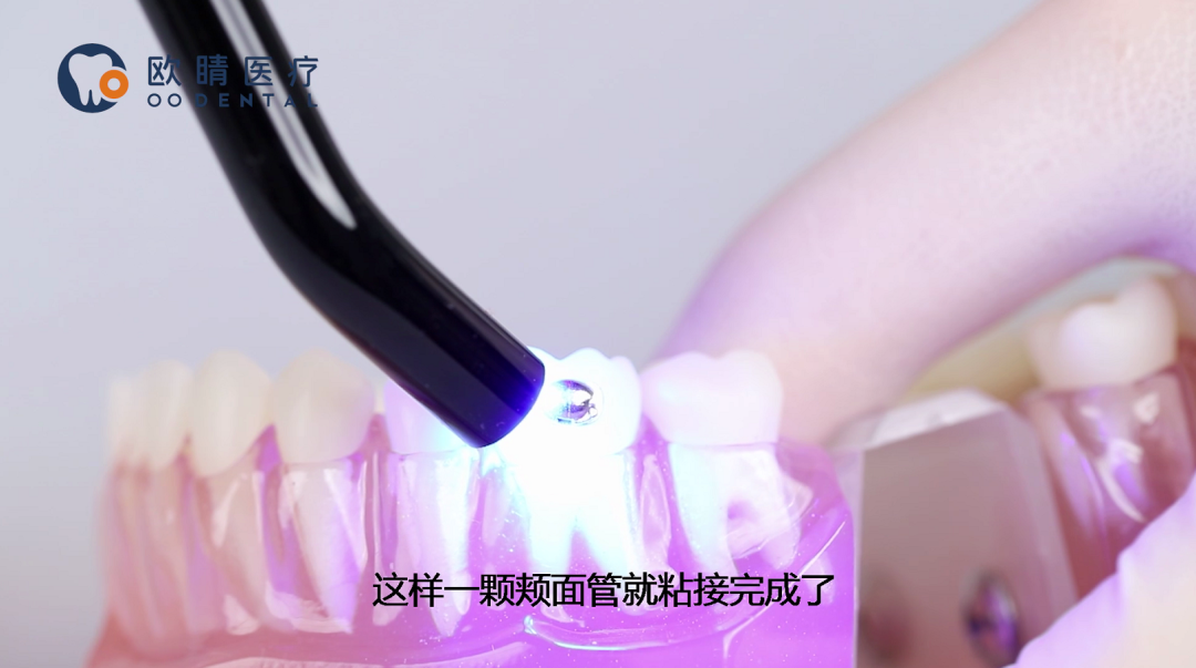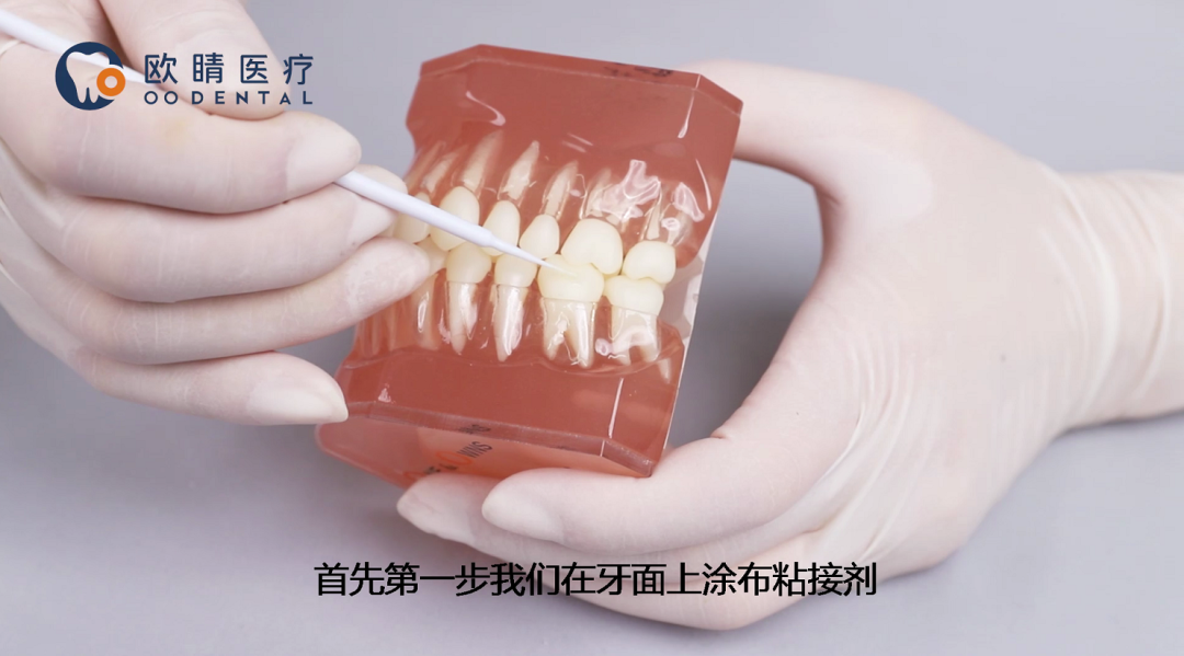 接下来,我们进行粘接操作,首先第一步我们在牙面上涂布粘接剂,然后进行光照。