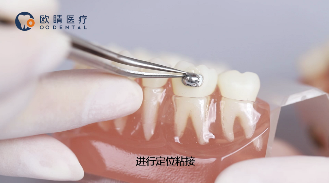 近远中我们可以参考托槽底板上面的发育沟的标记和牙面上面的发育沟来进行匹对,定位结束后就再次进行光固化固定,这样一颗颊面管就粘接完成了。