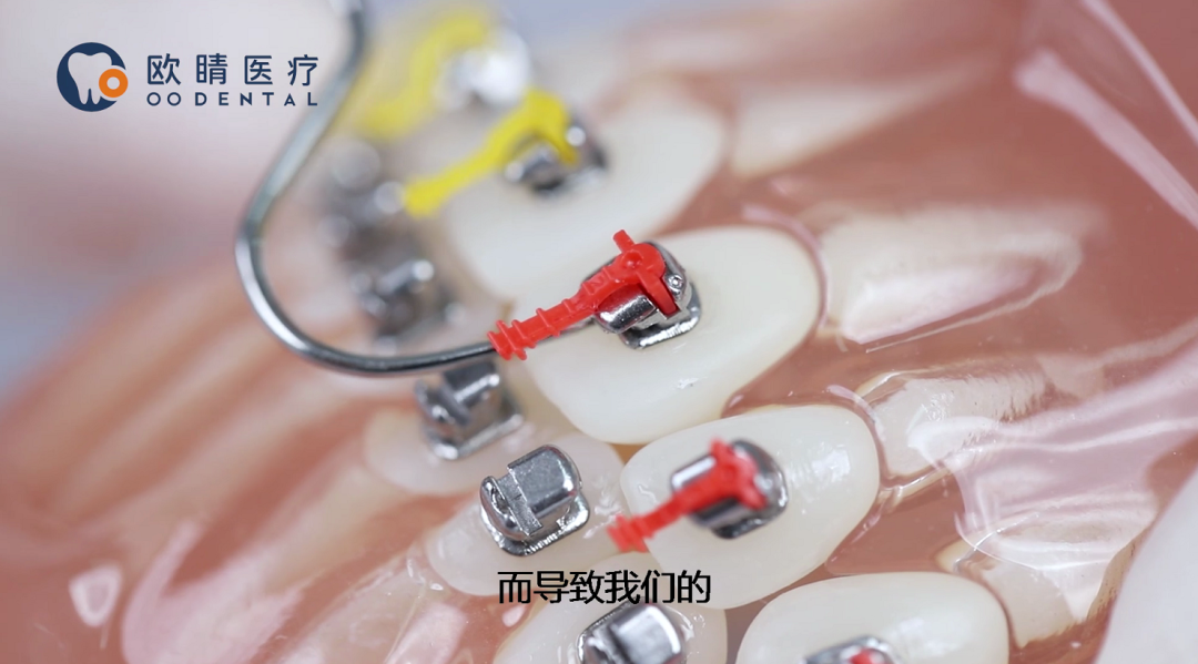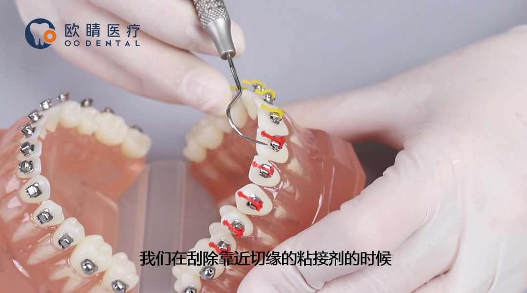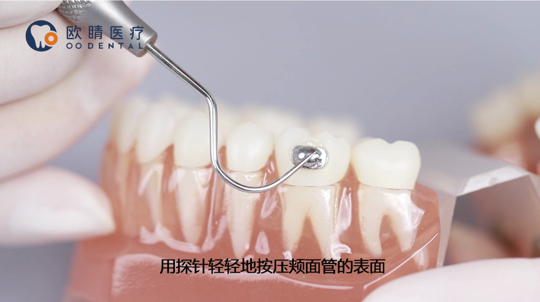 整一个颊面管的粘接要放在牙面中的1/3处,用探针轻轻地按压颊面管的表面把多余的粘接剂压出来,然后刮掉多余的树脂,确保不要有多余的粘接剂残留在牙面上。