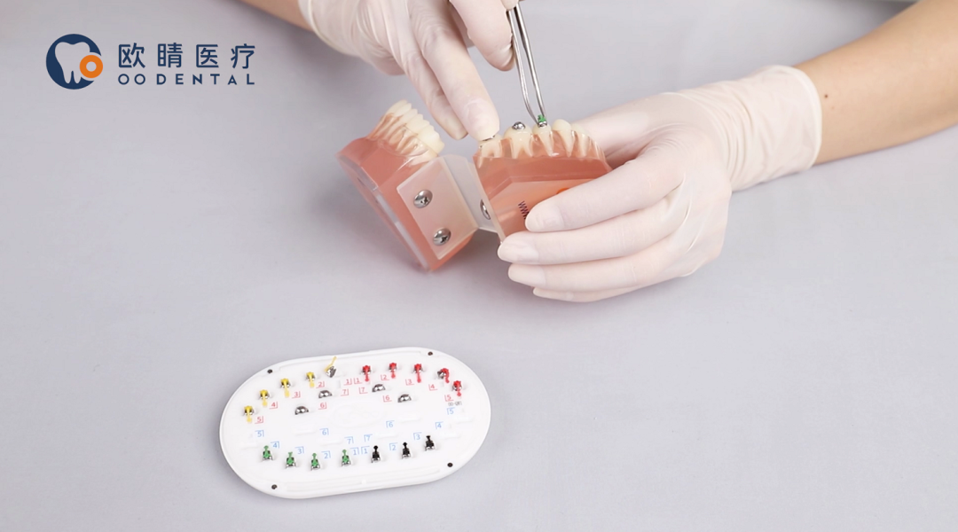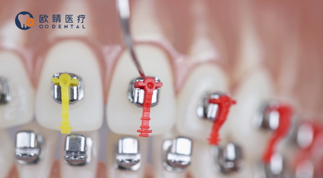 4个象限的托槽,分别标有四种颜色的标识杆,中间是8颗颊面管,采用欧欧专利的收纳设计,让托槽和颊面管按序排放整齐,不用担心托槽从盒子里发生脱落的情况,确保在临床使用上,即开即用。