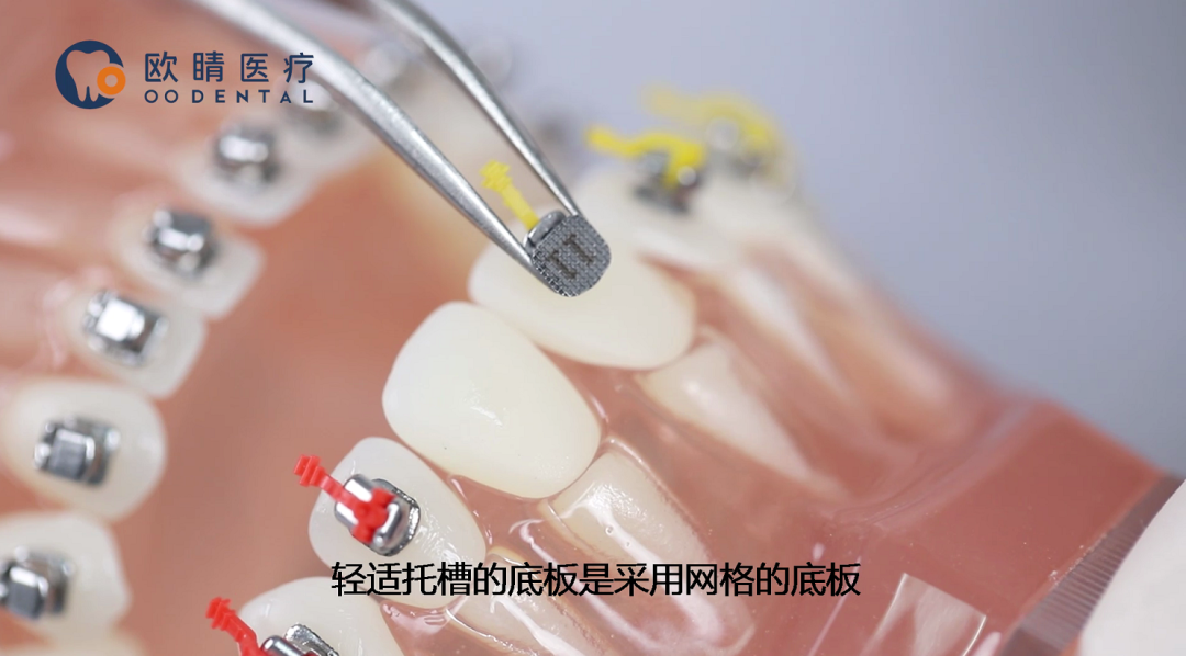 在临床上的粘接,一般的顺序都是从磨牙到前牙,从后往前这样的顺序。接下来我们粘一下托槽,按照临床的常规操作把剩余的托槽都粘好,轻适托槽的底板是采用网格设计的,也就是88目的底板,底板上面是有牙位标识的。