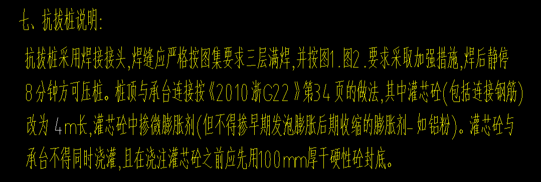 抗拔桩的焊接要求:图纸上有明确要求,要求焊接标准,焊接完成后需要间歇的时间。(如下图所示)