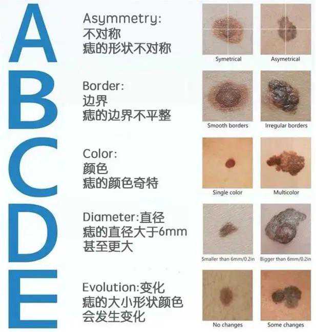 那么,什么样的痣需要引起注意,甚至提前预防性切除呢?简单的ABCDE口诀就可以帮您判断。