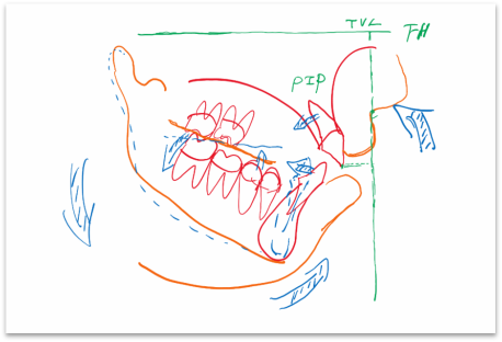 那么我来看一下下前牙,下前牙的长轴和下颌骨正中联合的长轴之间的关系,如果是唇倾,说明是下前牙的牙性问题。