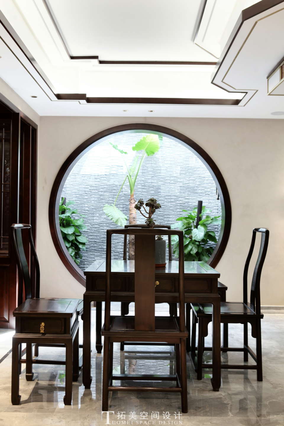月洞门,是通往诗意世界的入口,散发出宁静气息,闲坐于木椅,眺望门外光景,仿若与自然融为一体,微风轻拂,带来花香与鸟鸣,身处于一幅意境深远的江南之画,意境、材质、形态的完美融合,让空间呈现出一种雅致脱俗的美感。
