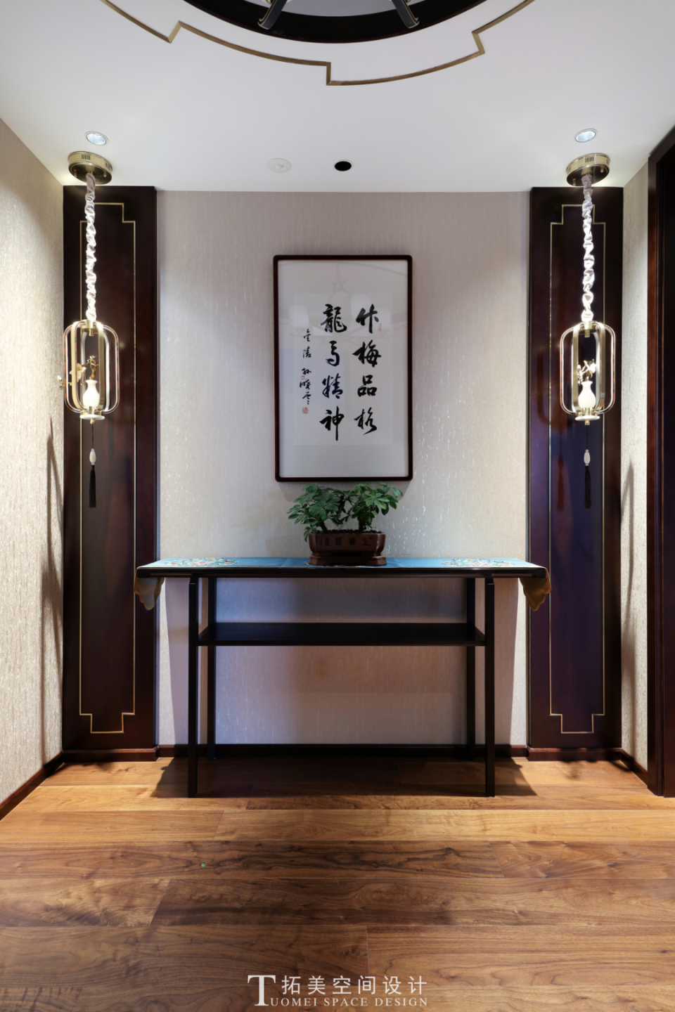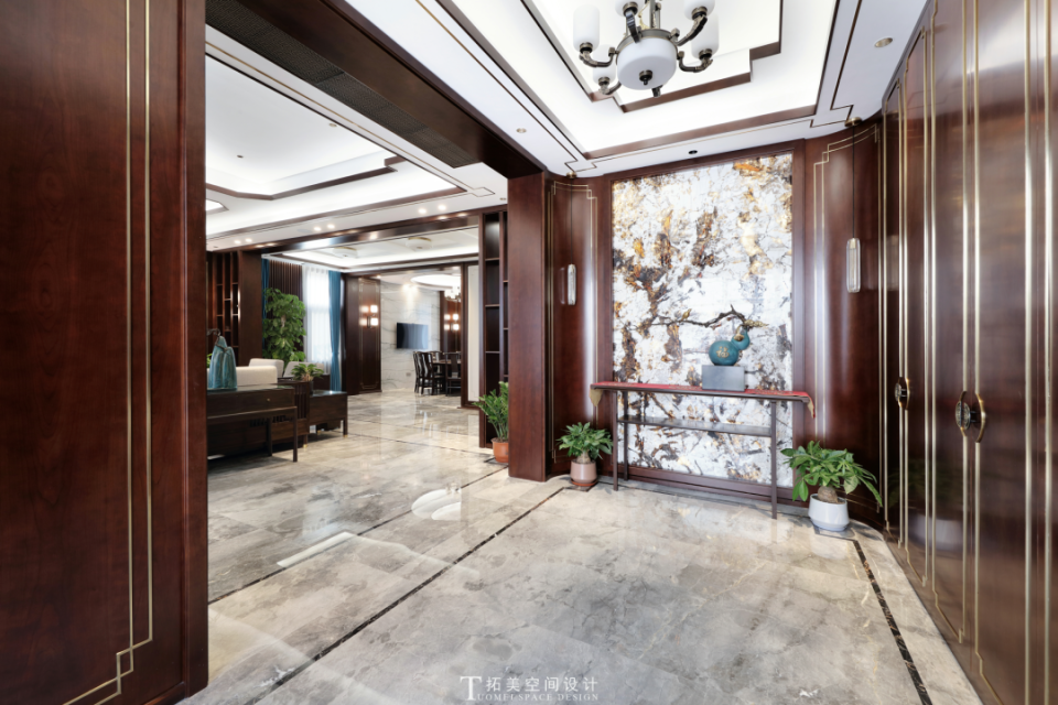 玄关承载着迎宾与展示的重要使命,设计师以奢石墙面为视觉亮点,灯光映射下的墙面金光流连,延展出奢贵典雅的气质,蓝色的葫芦宝瓶上侧枝旁生,更有燕雀报喜,摆件栩栩如生。