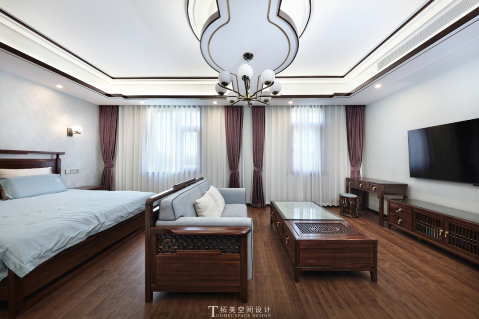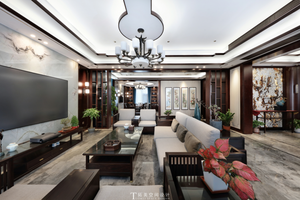 玉石镶嵌的电视背景,凸显了空间温润的质感,每一件家具都在细节处做了仿古设计,处处彰显着古色古香的韵味和深厚的文化底蕴。吊顶的造型曼妙柔美,灯光温柔清雅,沉浸其间,静心休憩,能感知东方韵味赋予生活的典雅和宁静。