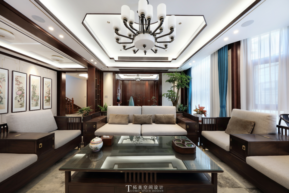 艺术的花鸟画一路指引,步入其间,沉浸在客厅东方艺术的美态中无法自拔。定制桌椅散发着庄重古朴的气息,无声地描绘着东方美学。在光影的交织中,岁月将空间雕刻成精美绝伦的艺术品。