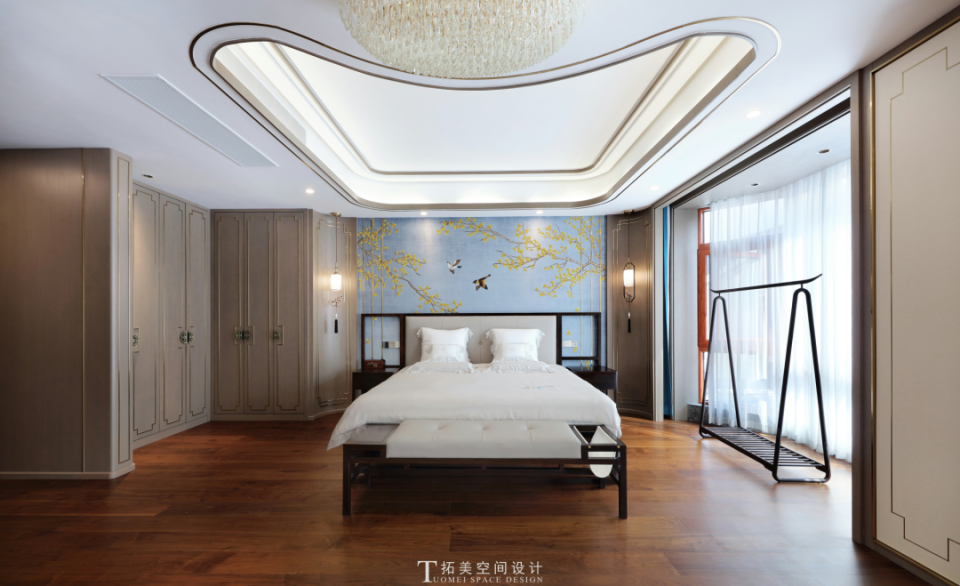 床头花鸟映卧榻,木质家具散古香,中间墙面隔断,分割梳妆区与休憩区,考究的布局强化了卧室的实用性与温度,将东方的古典美与现代的简约美融合,阐释出新中式的美学意义。