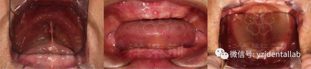上颌牙槽嵴中等度丰满,腭穹隆中等高度,后牙区牙槽嵴高度降低,上颌结节正常,无明显倒凹及骨突。下颌牙槽嵴顶呈现窄小低平的骨嵴,后牙区高度与宽度明显减少。双侧牙槽嵴吸收不对称,右侧吸收明显,磨牙厚垫呈梨形,无硬纤维组织,倾斜角度中等,开闭口变化不明显。下颌舌骨后窝区空间尚可。无尖锐的骨尖、骨突,无松软牙槽嵴。黏膜色泽正常,无明显溃疡及瘢痕。舌下海绵样组织中等,唾液分泌量较少。开口时舌后退明显。