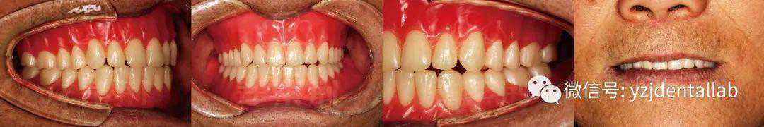 3)义齿初戴,就位平稳,无明显翘动,基托形态较好,边缘伸展合适,咬合关系尚可,义齿正中咬合时状态等同于合架上的排牙状态,颌位正常。