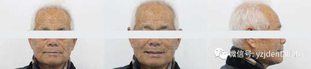 颌面部检查:患者颌面部左右对称,比例相对协调。唇、颊部向内凹陷,上唇丰满度欠佳,面部褶皱增加,嘴角皱纹明显增多,鼻唇沟加深,口角下陷,面下1/3距离变短,呈现衰老状面容;侧面面型为凹面型。