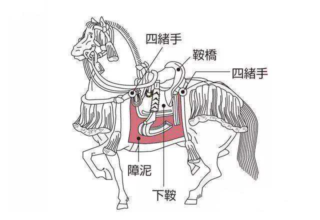 《三国志平话》卷下:“却说骑马夹间,曹公用鞍䩞遮其首,顺流而下。”说曹操被马超、韩遂军打败落水,用障泥遮首而逃。明朱有燉《义勇辞金》第三折:“短甲轻袍可体轻,戎鞍小䩞座红缨。”障泥经过漫长的发展史,不同地区和历史时期,障泥的样式不一,比如: