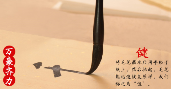 健,不是弹性强就是健。健,是指毛笔在变形之后能迅速回复原样,以便于下一个动作。如果弹性太强,动作还没做完它就要回复原样,会让人感觉毛笔不听话。而如果弹性不够,动作做完毛笔就变形了,下一个动作无从谈起。具体来说,毛笔的健分为笔锋、笔腰和笔根三部分。笔锋健,要制笔主毛料好;笔腰健,需要制笔的辅料和工艺好;笔根健,需要根部的填充材料好并且栽得深。这些都不是初学能鉴别出来的了。