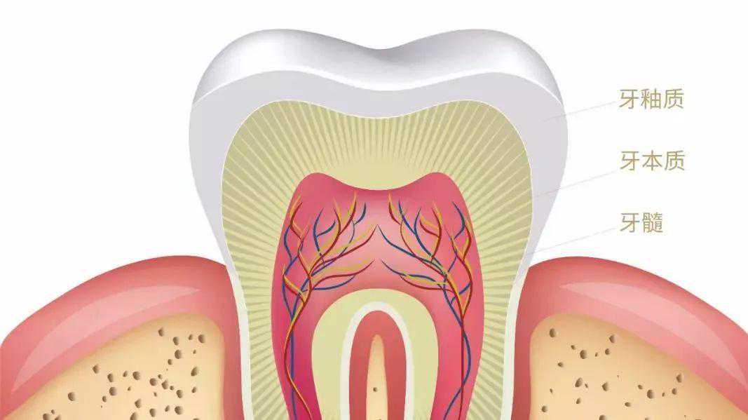 我们的牙齿,分为牙冠和牙根。正常情况下,我们看得到的部分,叫做牙冠。由外至内,分别是:牙釉质、牙本质和牙髓。