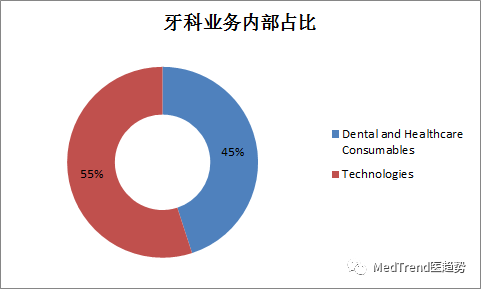 牙科和医疗耗材占总体营55%,技术占总体营收45%。