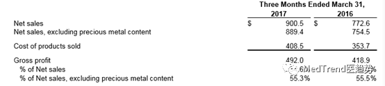 2017年牙科业务营收2017年Q1登士柏西诺德业务营收情况: