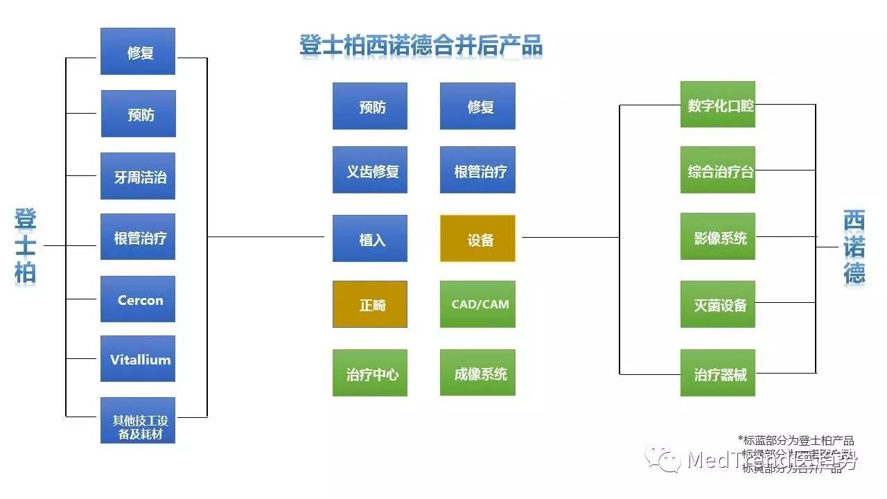 ▲登士柏西诺德合并前后产品变化图