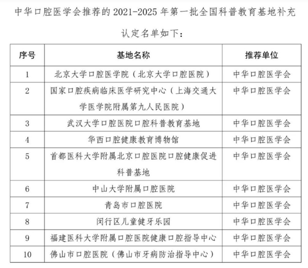 半岛网9月15(记者于千千)9月12日-14日,中华口腔医学会第25次学术年会在上海国际会展中心顺利召开。会议期间,由中华口腔医学会遴选推荐,被中国科协评选为2021-2025年度全国科普教育基地的10家单位被授予中国科协颁发的“全国科普教育基地”牌匾和证书。青岛市口腔医院荣获“全国科普教育基地”(2021-2025)称号。