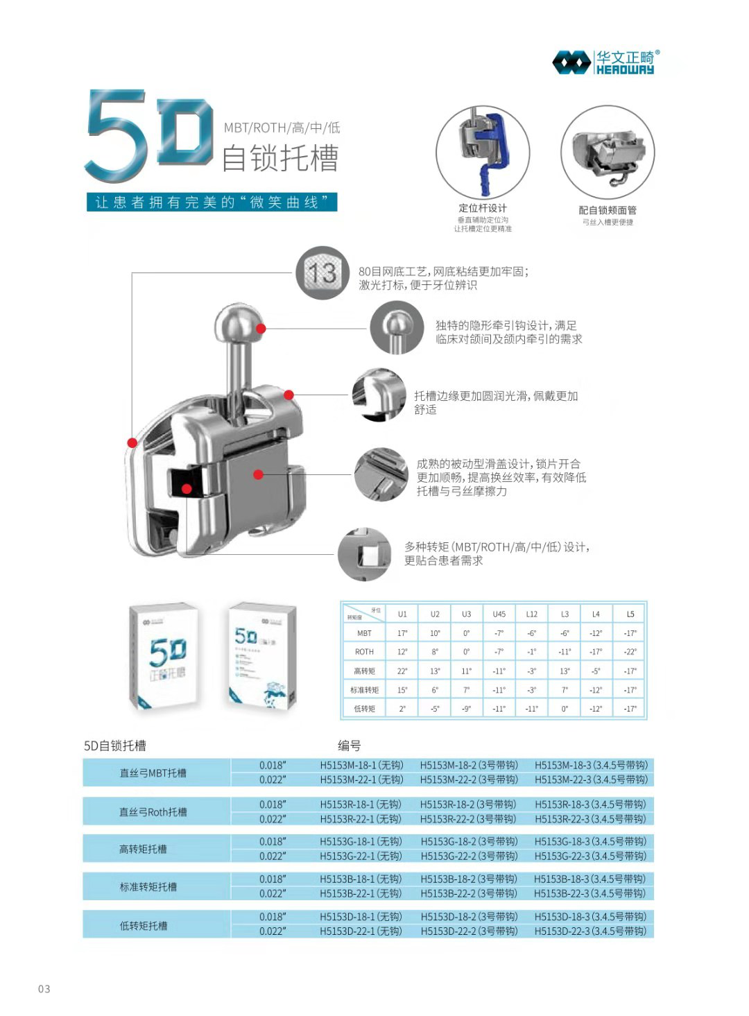 5D自锁托槽具有网底工艺,网底粘结更加牢固;激光打标,便于牙位辨识:独特的隐形牵引钩设计,满足临床对颌间以及颌内牵引的需求;托槽边缘相比于普通自锁托槽更加圆润光滑,佩戴更加舒适;拥有成熟的被动型滑盖设计,锁片开合更加顺畅,提高换丝效率,有效降低托槽与弓丝摩擦力;多种转矩(MBT/ROTH/高/中/低)设计,更贴合患者需求。