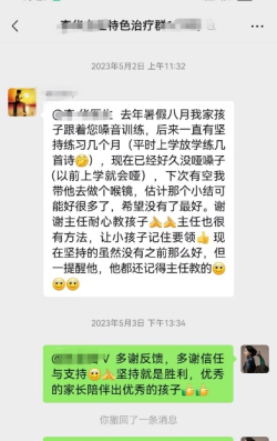 嗓音矫治课上,专业人员会面对面指出问题所在,调整呼吸及发声,充分利用喉腔、口咽腔、鼻腔及头颅的共鸣作用,并通过听觉、视觉、触觉反射让患者自己感知比对,放松喉部肌肉,找到发声的舒适感,以求达到适合自己的最佳发声效果。