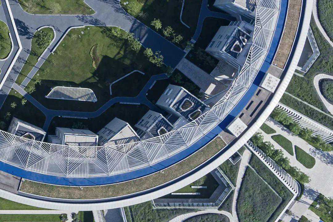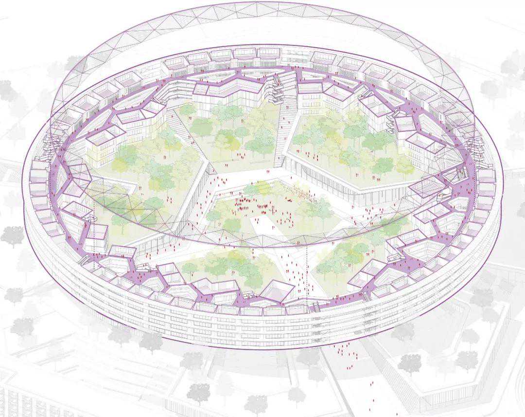传统的校园中,自然与教育像是两个独立的系统,天然的被阻隔,而建筑师希望将自然引入校园。环形教学楼外是如同森林的状态,隔离城市的喧嚣,环内设置中心花园,叠落起伏,同时充分确保内外的通透与关联。