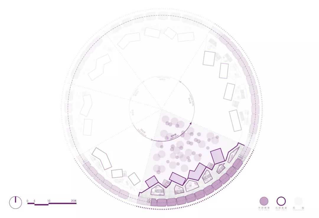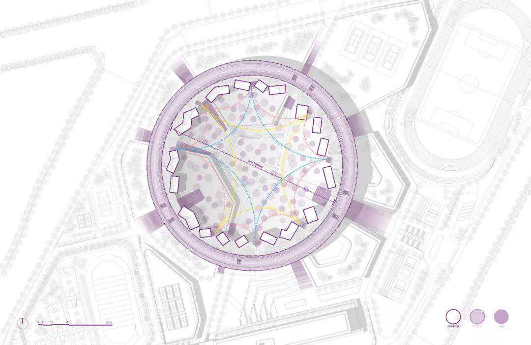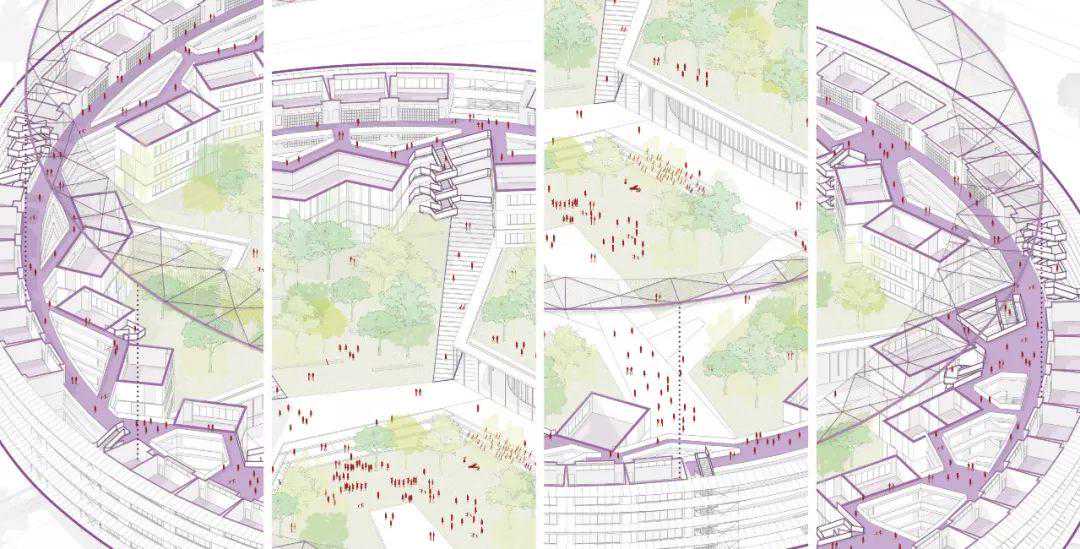 沿外环和内环分布着大小不等的教学空间,环形外圈的教室在流线上更强调效率,内部一般是活动性比较强的选修课教室,自由错落分布。
