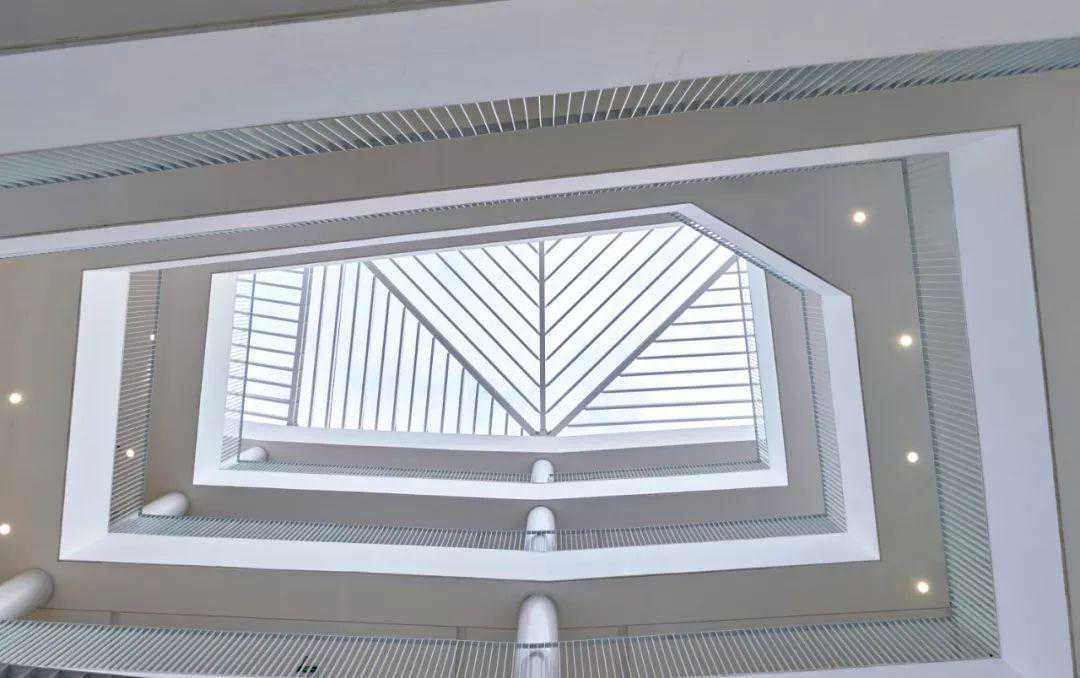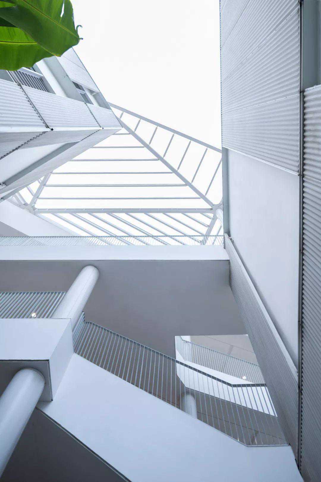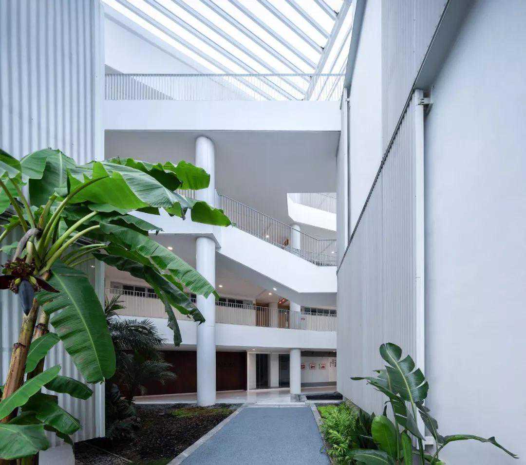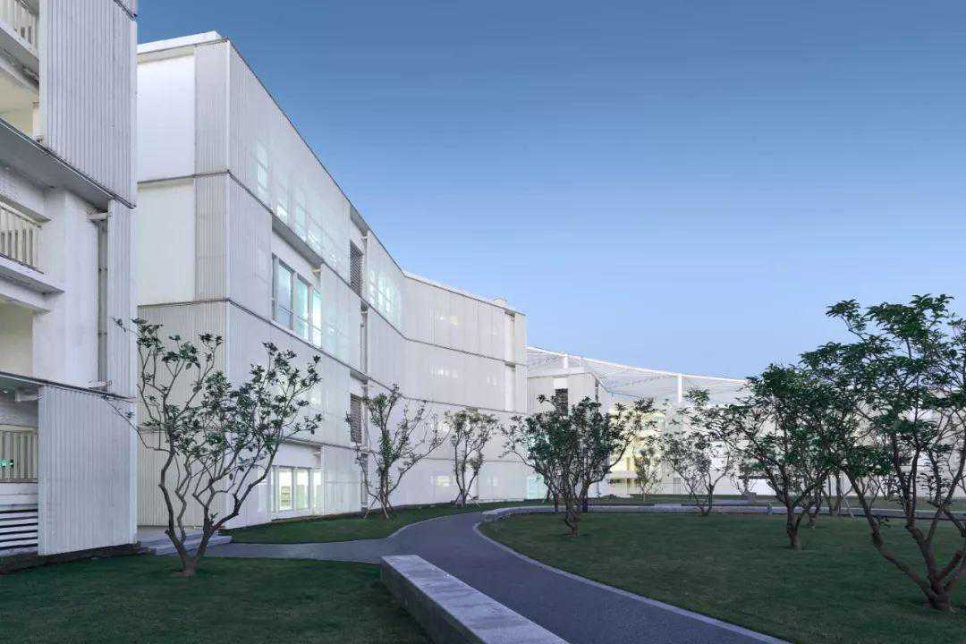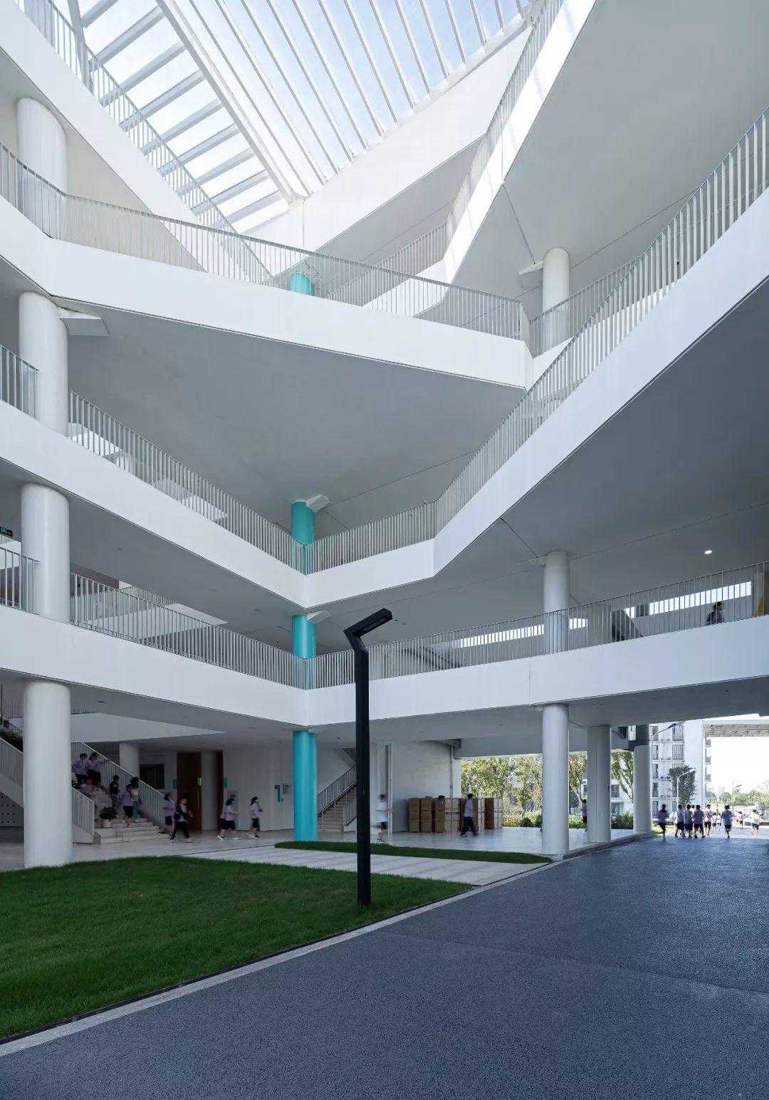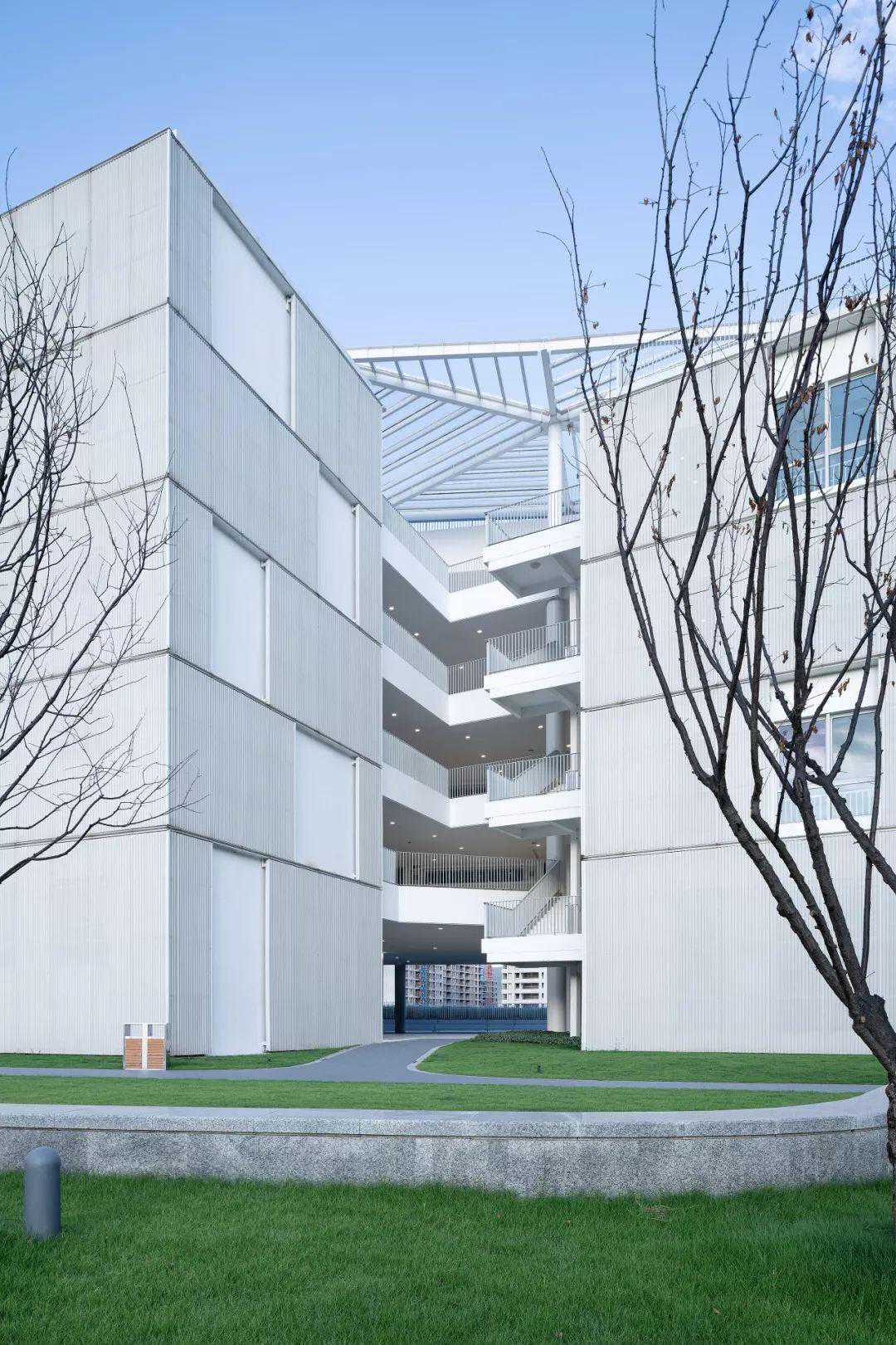动静有致的校园,成为课间10分钟的活力催化剂。内庭院犹如峡谷般的高低起伏,学术报告厅和礼堂则顺势而建,场地中不乏生态气息,内圈模数化顶棚为场地带来了必要的光线控制,整体立面则采用竖向格栅遮挡黑板区直射光线,这样的方式也为空间加入些许律动。