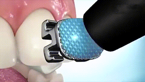 接下来使用光固化灯快速固化粘接剂,使托槽牢牢固定在牙齿上。然后在其他牙齿上重复同样的步骤,直到所有托槽都安装完成。
