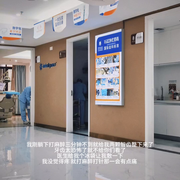 医生说我要把上面的两颗智齿拔掉,因为不拔牙齿没有间隙调整,会影响到后期矫正。我刚躺下打麻醉三分钟不到就给我两颗智齿整下来了,牙齿太恐怖了就不给你们看了。医生给我个冰袋让我敷一下,我没觉得疼就打麻醉打针那一会有点痛。
