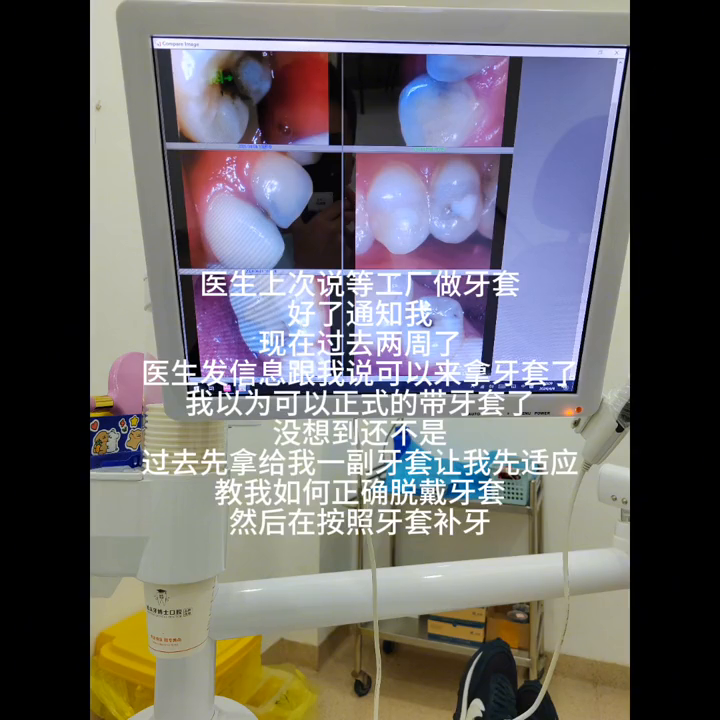 回去以后到了晚上就开始有点痛,但是对我来说不痛我可以忍受。到了睡觉时候没想到这种痛让我难以入睡,翻来覆去睡不着但想想能修好牙齿就算了。医生上次说等工厂做牙套好了通知我,现在过去两周了,医生发信息跟我说可以来拿牙套了。我以为可以正式的带牙套了,没想到还不是。